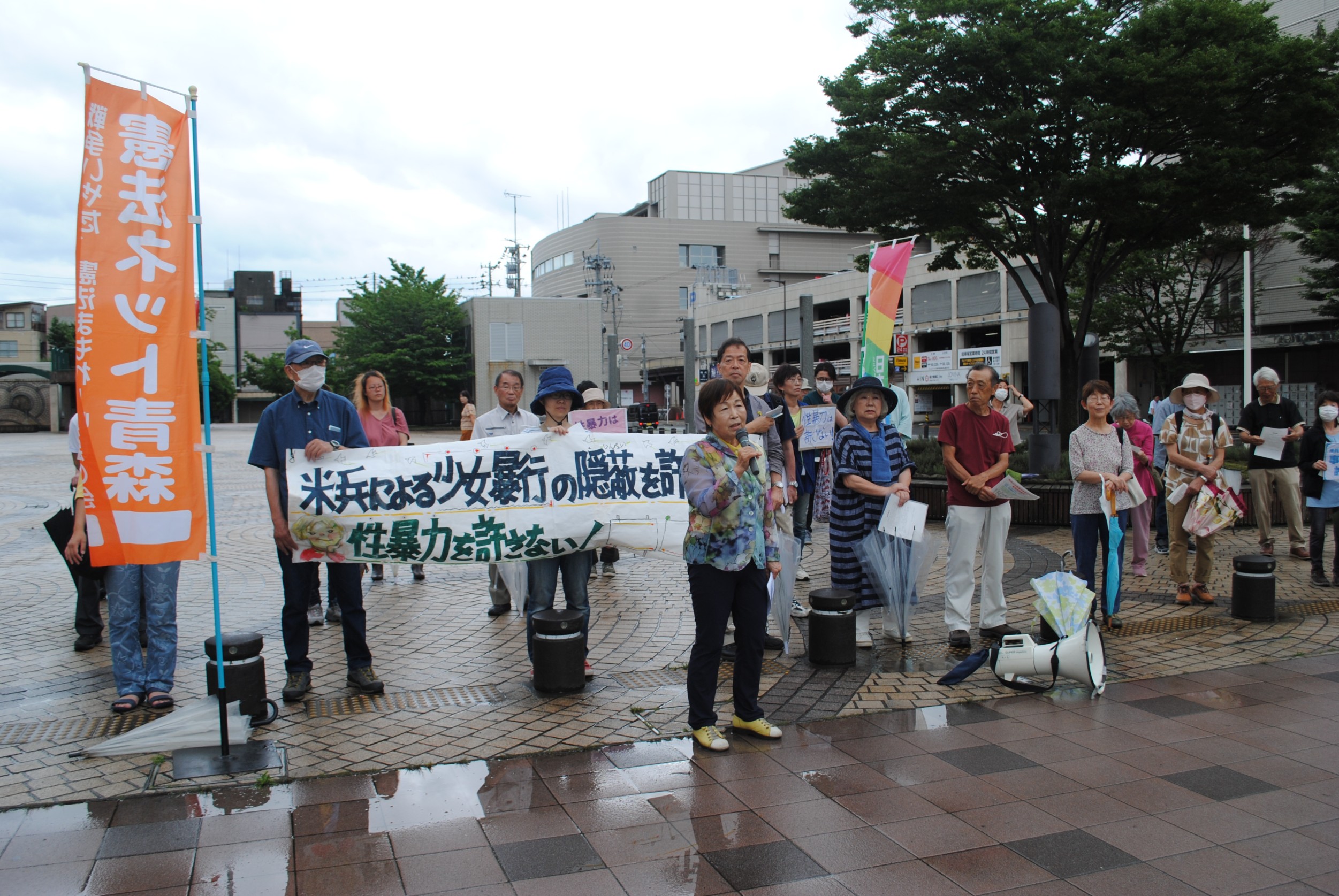 7月29日 午後12時半より青森駅前公園にて「米兵の女性暴行を許さない!青森市民集会」があり参加しました。リレ―トークで日本共産党統制地区委員長斎藤美緒さん、青森県平和委員会共同代表阿部喜美子さん、青森県革新懇事務局長一戸義規さん、そして私が県議会議員として議会でのこの問題についての経緯を報告しました。