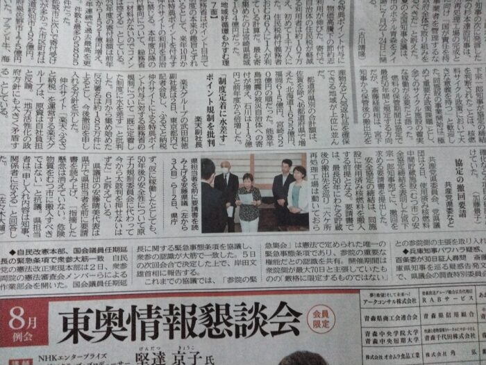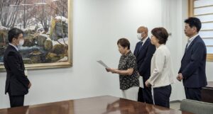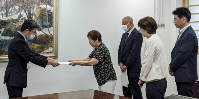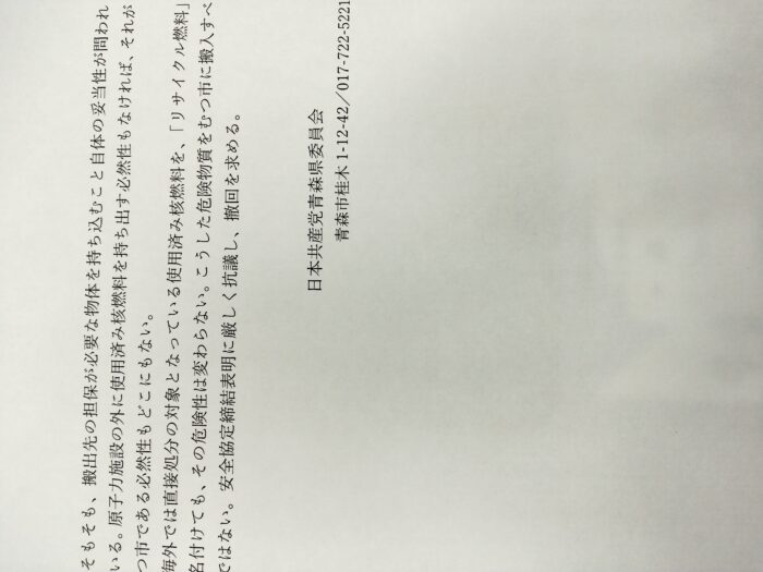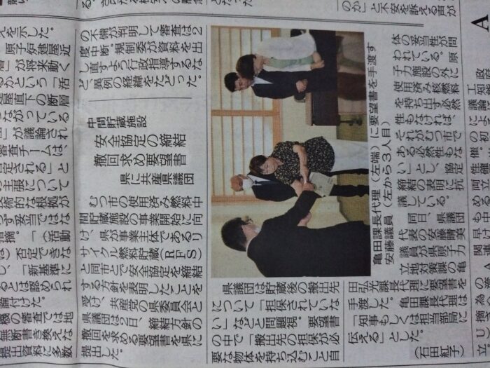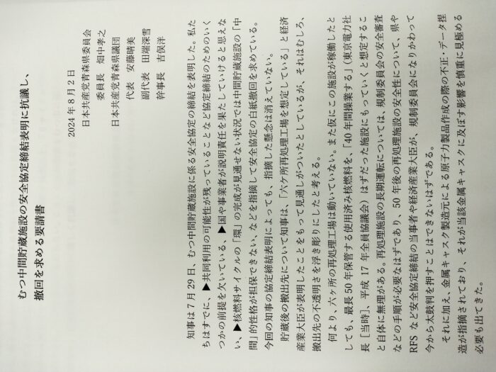 8月2日日本共産党県委員会と県議団で県知事に対し「むつ中間貯蔵施設の安全協定締結表明に対し抗議・撤回要請」を行いました。県環境エネルギー部原子力立地対策課の亀田弘光課長代理が受け取りました。