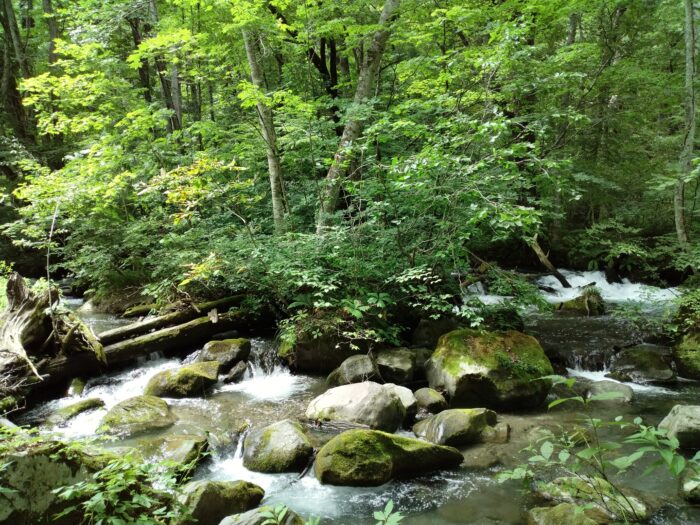 8月8日 3人の県議団で八甲田・十和田を愛する会の久末正明代表に案内していただき奥入瀬渓流の土砂堆積状況や制水門、その流れ状況がよくわかるという銚子大滝などを調査しました。