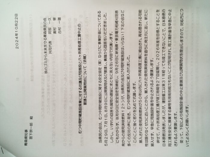 核のゴミから未来を守る青森県民の会 24 10月 Posted on 2024年10月24日2024年10月24日Author ando-harumi 0 10月22日 「核のゴミから未来を守る青森県民の会」の県知事に対しての要請と公開質問状の提出に日本共産党県議団が同席しました。 原子力立地対策課亀田弘光課長補佐が答えました。