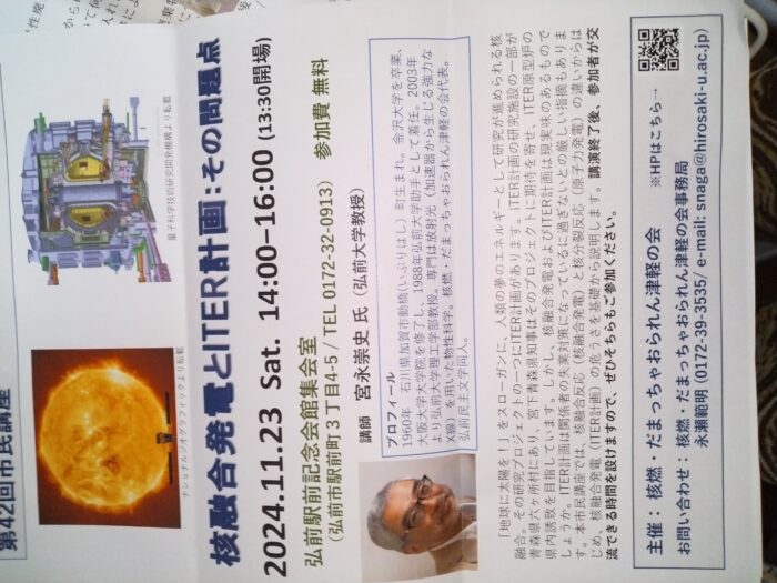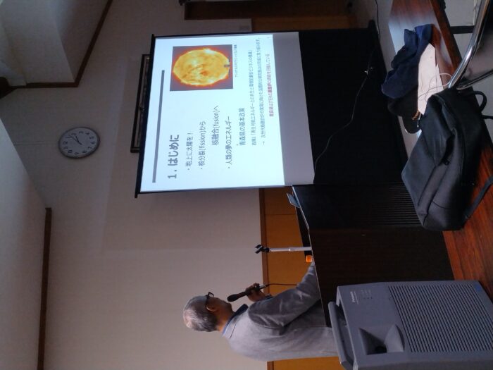 今回の講座は、当会代表の弘前大学理工学部教授による「核融合とITER計画:その問題点」でした。