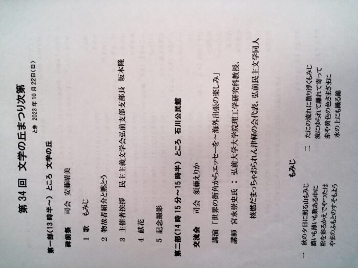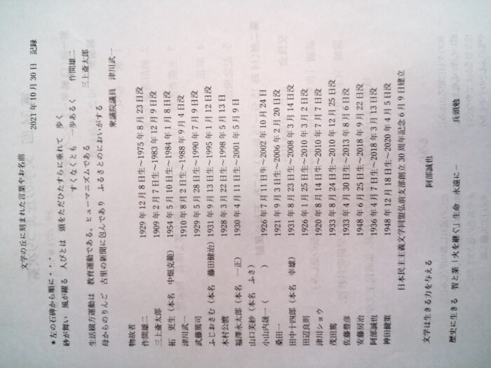 第二部は石川公民館で行われました。石川の大仏公園の先にある文学の丘の6つの文学碑には、二部で語って頂いた作間しのぶ・咲間まみ両氏の父作間雄二や津川武一・阿部誠也・安藤房治・神田健策ら19人の民主主義文学会弘前支部に所属し亡くなられた方々の名が刻まれています。