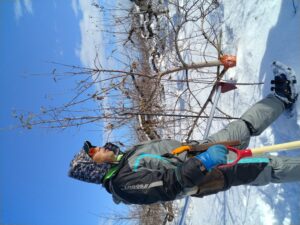 さらに山手のりんご園地は積雪量も多く、園地に行くまでに自ら農道の除雪を2時間かけて行い、そこからかんじきをはいて1時間半歩いてやっと園地に着いたそう。だいぶ被害が大きいと訴えておられました。