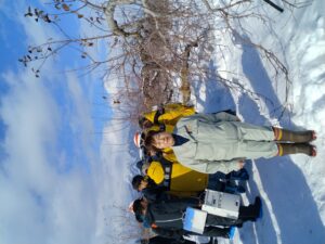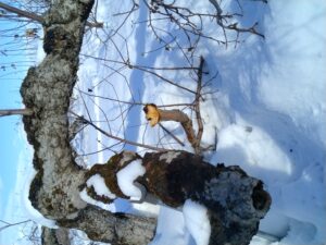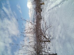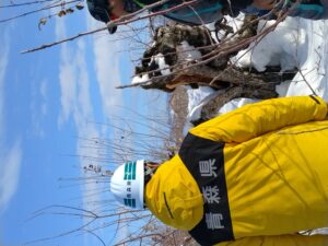 除雪された農道沿いにある石岡さんの園地を調査させて頂きました。園地に入りやすいという所なのでりんごの上にたまった雪はだいぶ下ろされていました。