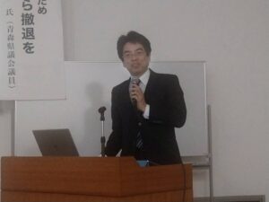 3・11さようなら原発弘前集会 14 3月 Posted on 2025年3月14日2025年3月14日Author ando-harumi 0 2月1日 3・11さようなら原発弘前集会が文化センターであり、吉俣洋県議が講師を務めました。 開会のあいさつは核燃だまっちゃおられん津軽の会宮永嵩史代表が挨拶 副代表の私は、福島伊東達也さんからのメッセージを読み上げました