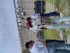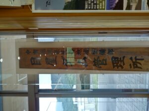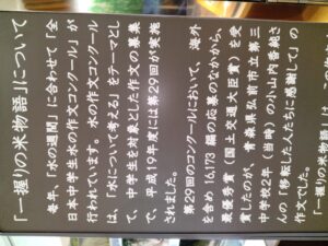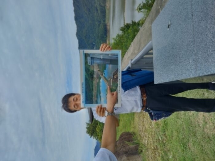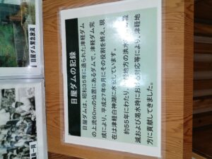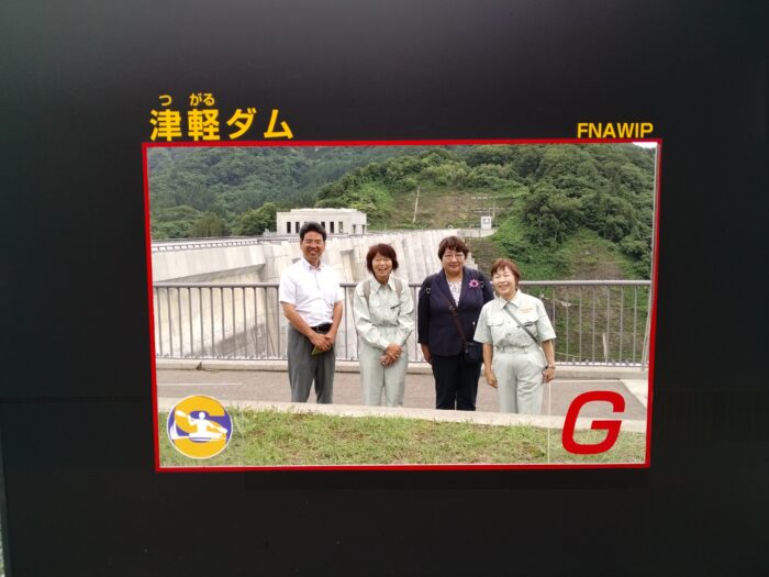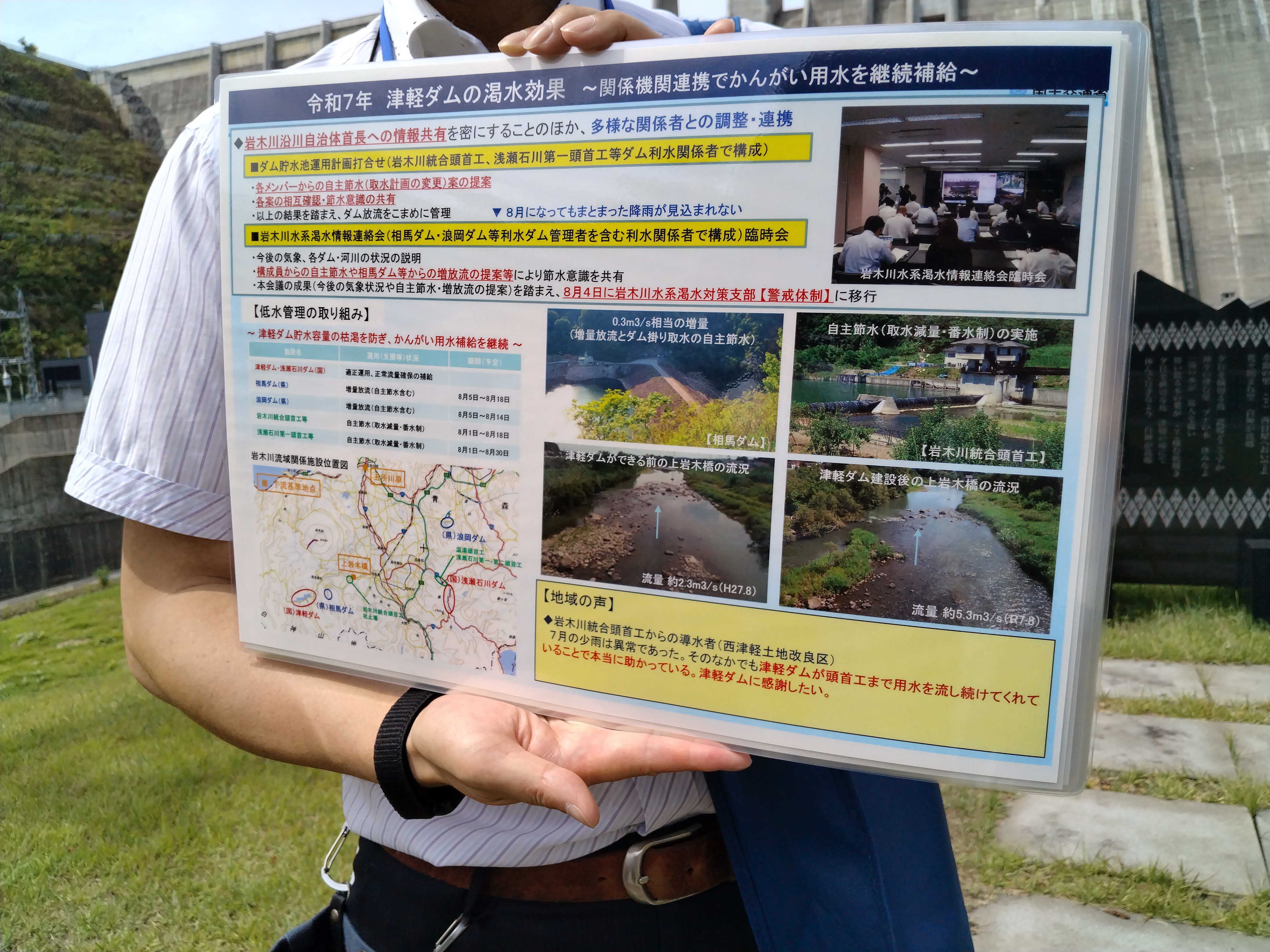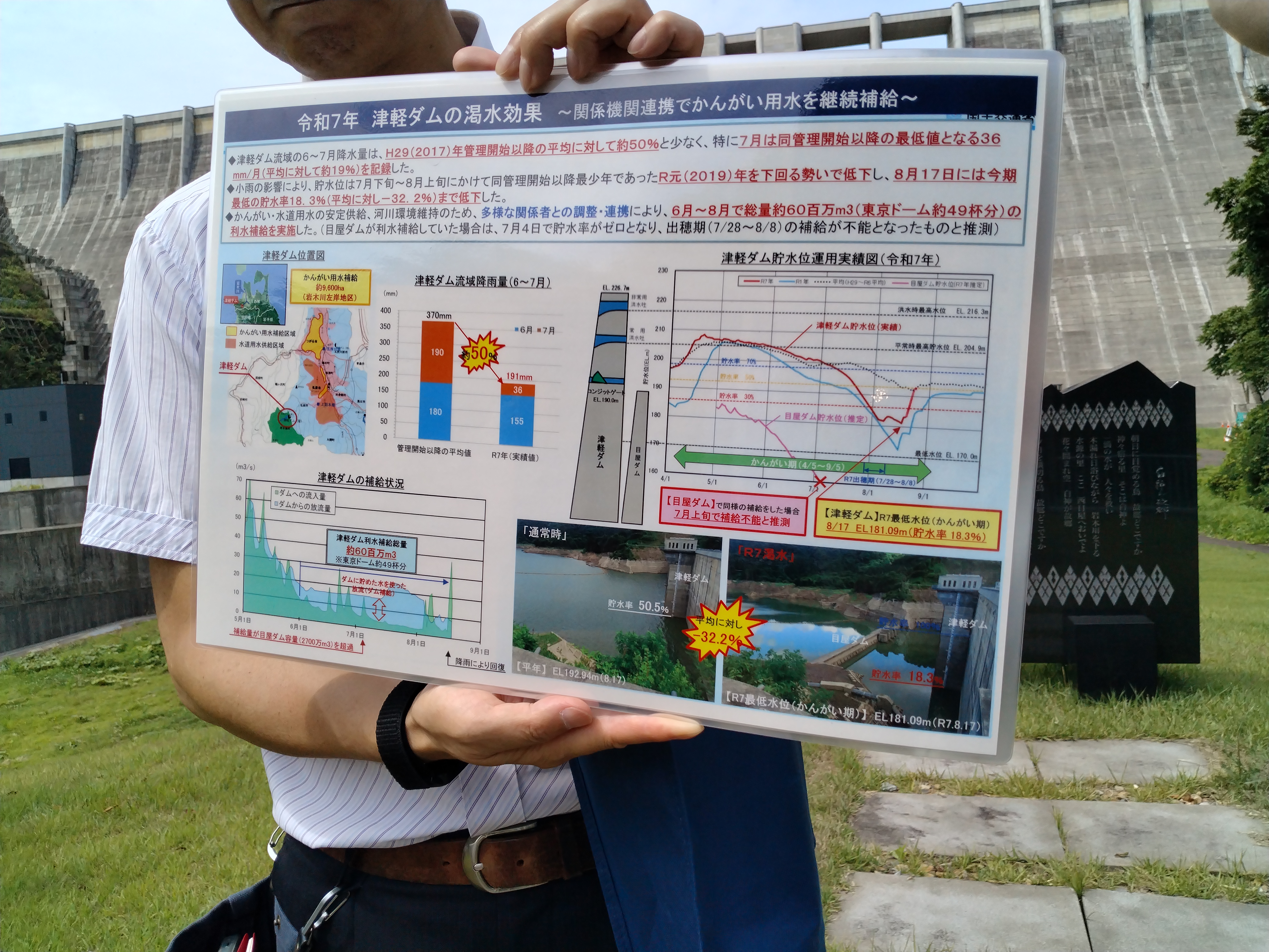 行った日は貯水量が50%になっていましたが、雨が降る前の8月7日には18.3%という危機的な状況で指で指しているように、前の目屋ダムが見えていたそうです。説明して下さっている方は、国土交通省東北地方整備局岩木川ダム統合管理事務所岩花賢(さとし)副所長です。パネルを持っている方は、同事務所五十嵐悟(さとる)調査課長です。