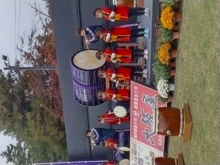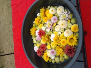 何とか雨が降らずに曇天の中での開会式でした。テープカットの代わりに水の張った鉢に花を生ける手法でした。