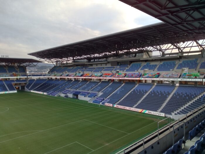 ここのスタジアムはジャパネット高田が複合施設として運営しています。その立派さに驚きました。