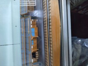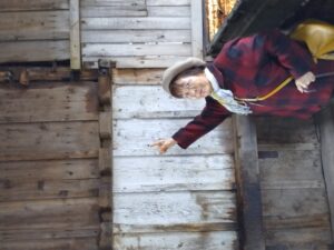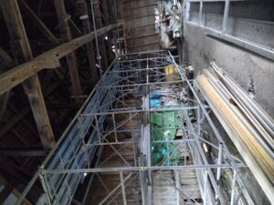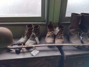 手で指しているのは、兵舎の中の銃を掛けるところ 倒壊寸前のため対策が講じられている