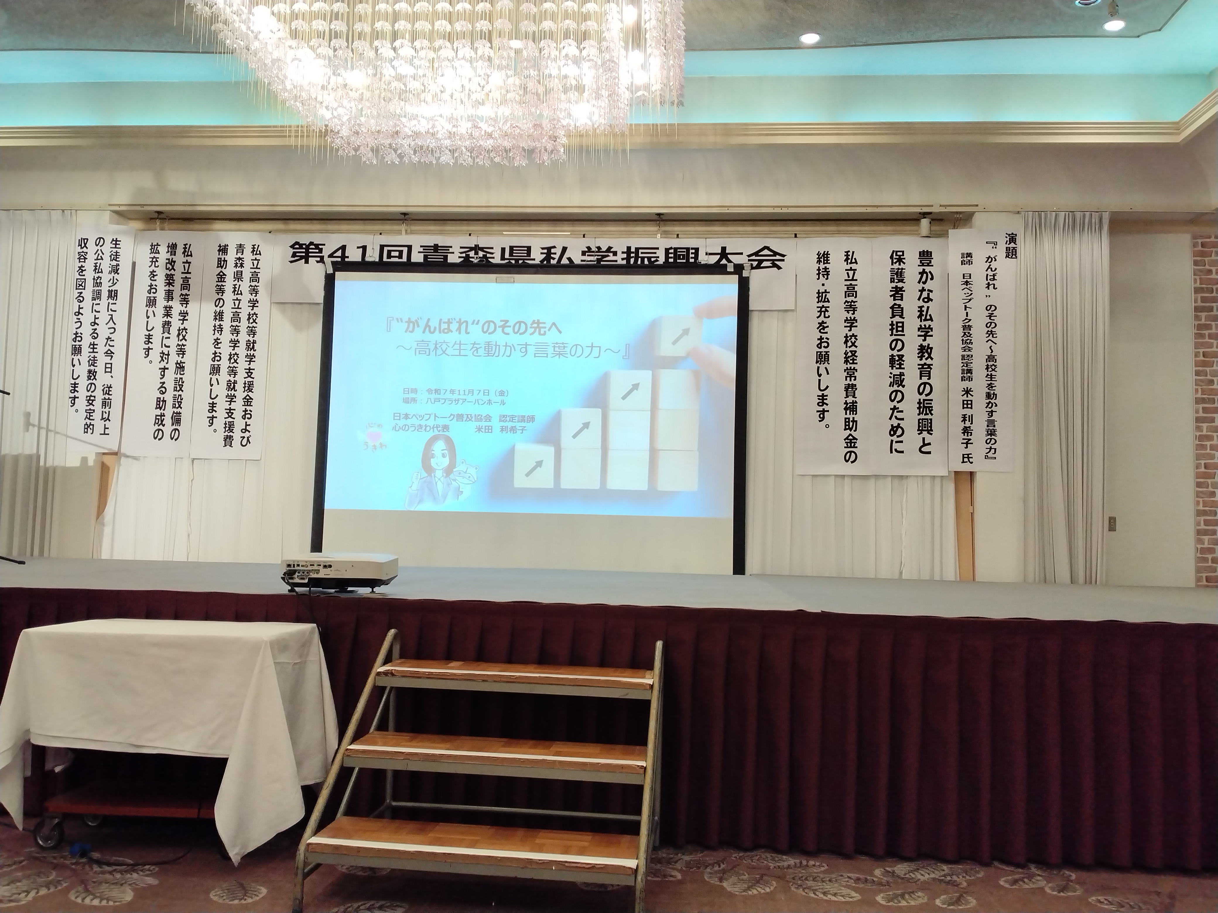 私学振興大会 11 12月 Posted on 2025年12月11日2025年12月12日Author ando-harumi 0 11月7日 八戸市で開かれた私学振興大会に出席しました。 私立高等学校経常費補助金の維持・拡充や増改築事業費に対する助成の拡充などを求める決議案が採択されました。 記念講演は日本ペップトーク普及協会認定講師 米田利希子氏による演題「がんばれのその先へ 高校生を動かす言葉の力」のお話でした。 知事来賓挨拶