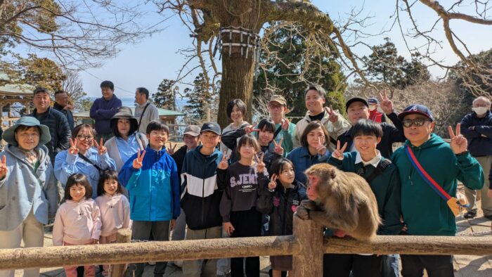 飼育員の方がサルを誘導して下さり記念撮影! 私の他息子4人と嫁3人孫10人の総勢18人で(一人来れなかった孫1人と嫁1人)