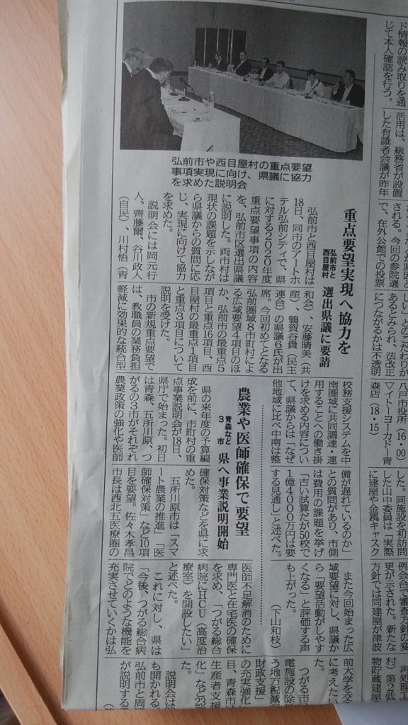 7月18日アートホテル弘前シティで、弘前市及び西目屋から県に対する2020年度最重点要望事項、重点要望事項についての説明が、弘前市選出の県議会議員に対し行われました。